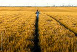 Rear view of confident farmer walking in wheat field at sunset.
