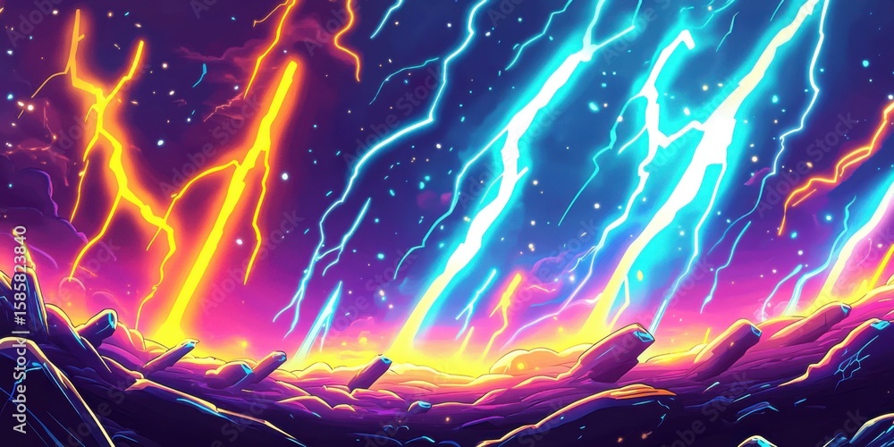 Vibrant and colorful cartoon lightning bolts streaking across a dynamic background- perfect for game design- comic books- and fantasy themes.