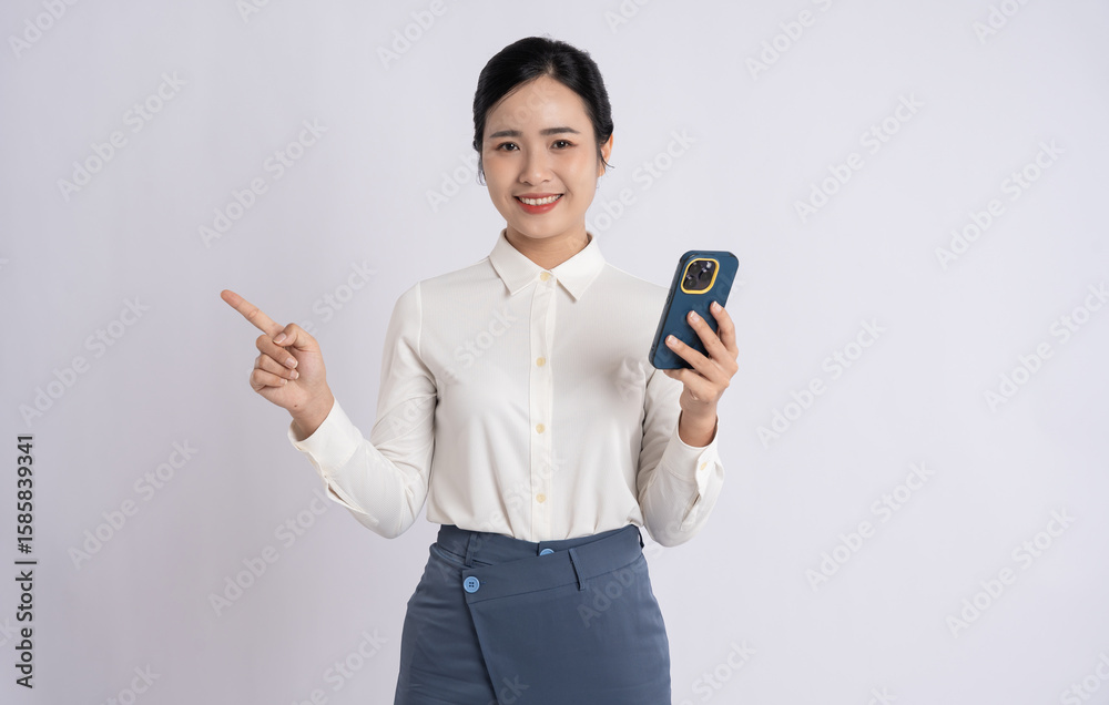 Smiling woman in business attire holds a phone and points to the side with a bright inviting look