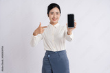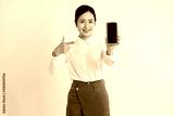 Smiling woman presents phone with blank screen pointing to it in front of white backdrop