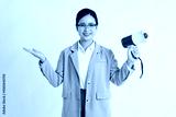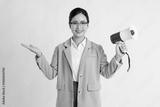 Enthusiastic spokesperson shares message with a megaphone dressed in business casual attire