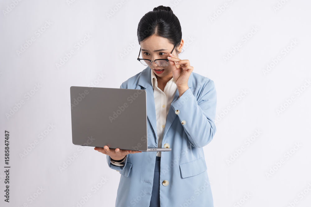 Surprised woman in business attire looks at laptop with hand on glasses set against white background