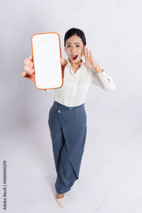 Excited woman showing phone display while calling out to someone in an airy neutral studio