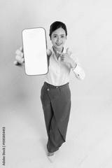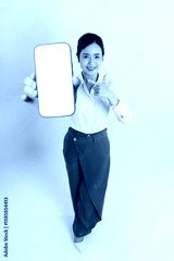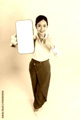Professional woman presenting a phone screen with a white display and friendly gesture