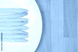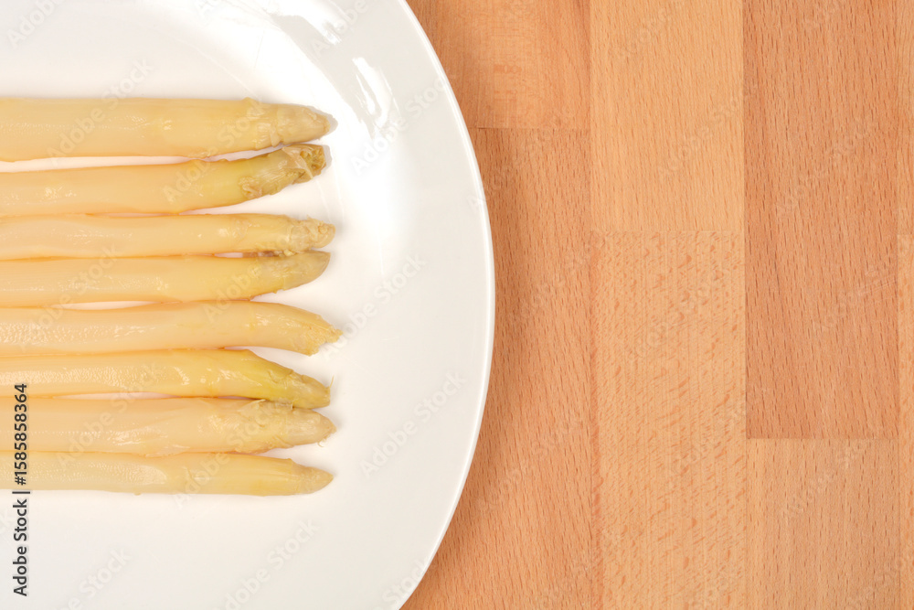 A white plate with several cooked white asparagus spears is positioned on the left, leaving ample copy space on the right side of a light wooden surface