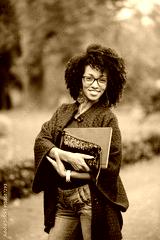 Young fashionable professional black woman outdoor in autumn carrying laptop. Cheerful stylish lady with afro hair and glasses.