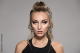 Beautiful woman in black dress. Hairstyle and bright make-up.