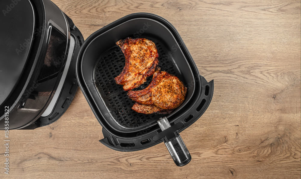 Two seasoned pork chops rest in the open basket of a black air fryer on a wooden kitchen countertop, freshly cooked to golden perfection
