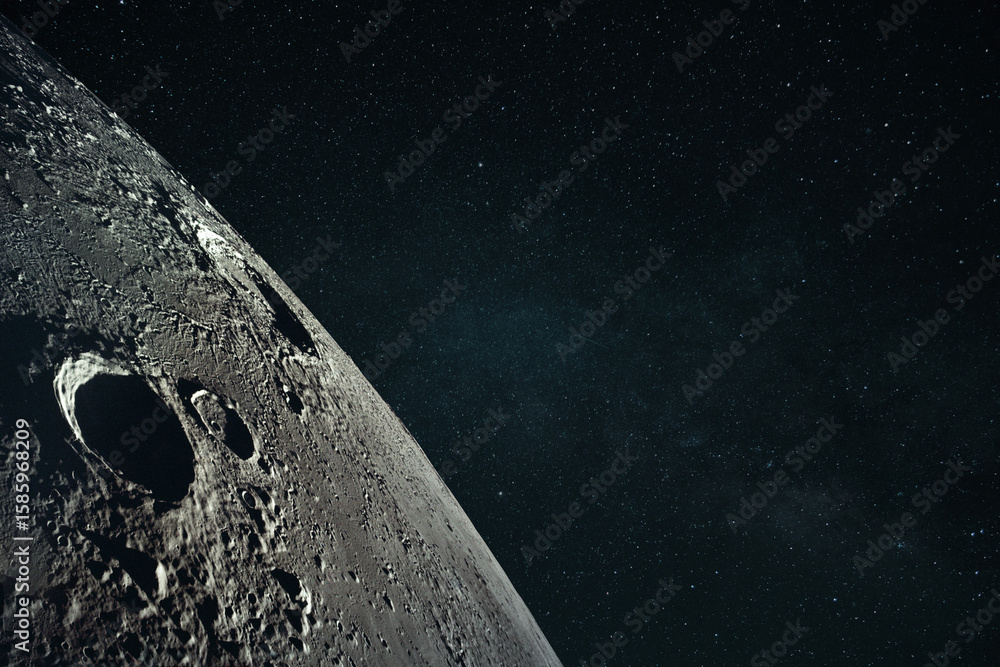 Close-up view of the Moon's surface with deep craters and rugged terrain, set against a starry night sky. Concept of space exploration, astronomy, and the cosmos.