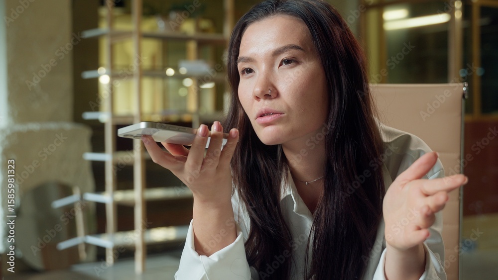 Asian business girl woman female Chinese send message audio mobile phone talking in office record voice mail speakerphone Korean Japanese businesswoman speak to mic architect engineering company call