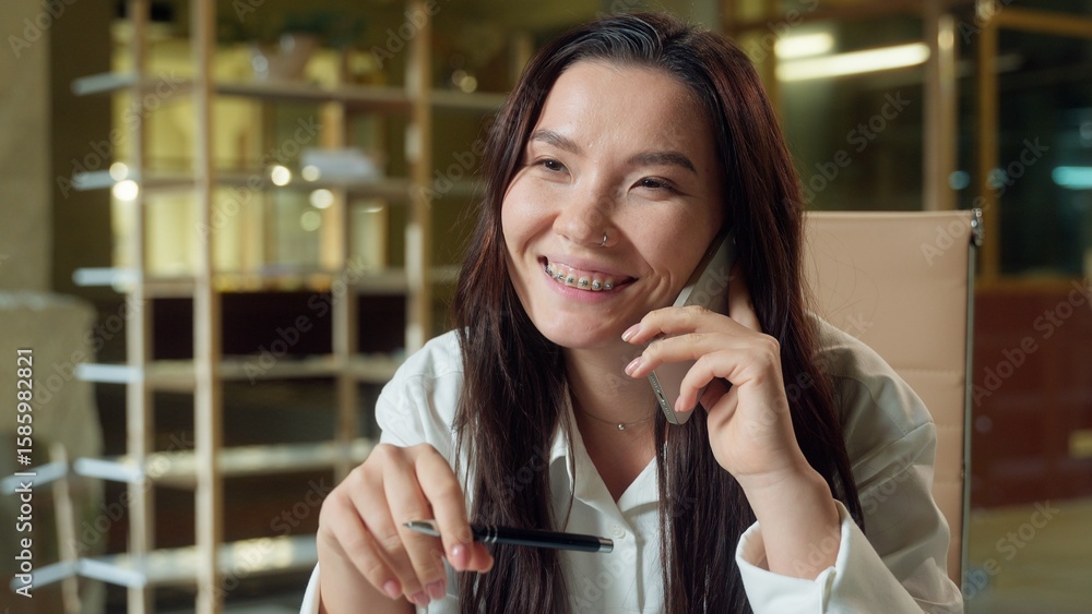 Businesswoman in office working Asian business woman entrepreneur designer talking mobile phone smiling girl consulting discuss online work laptop Chinese Korean Japanese female planning writing notes