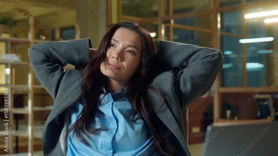 Asian business woman engineer architect at office desk project windmill electricity power company tired businesswoman Chinese Korean Japanese girl overwork stretching hands relaxing end working day