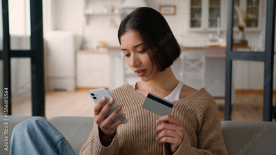 Caucasian hispanic woman thoughtful pensive girl female homeowner buyer shopper shopping online internet store purchase think choose order delivery at home buy pay credit card mobile phone bank app
