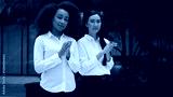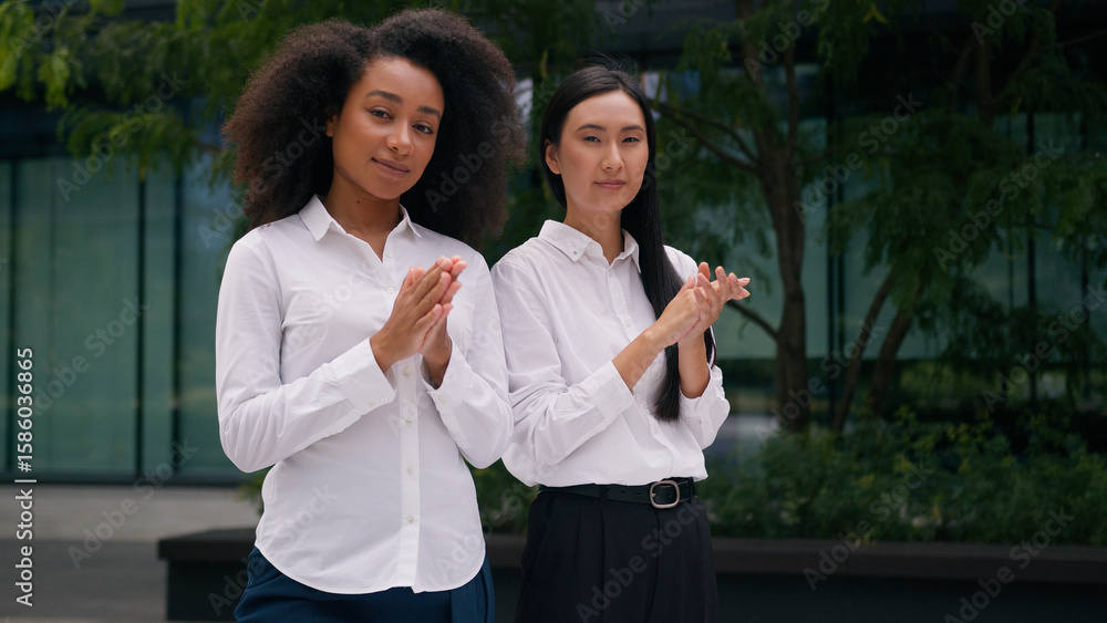 Two Asian Korean Chinese African American women businesswomen applause cheering clapping congratulate achieve deal partners cooperation colleagues coworkers females girls business success city outdoor