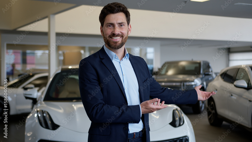 Caucasian man showing welcome invite following hands gesture male businessman car calling dealer automobile rent service auto buying manager salon client guy driver credit driving salesman consultant