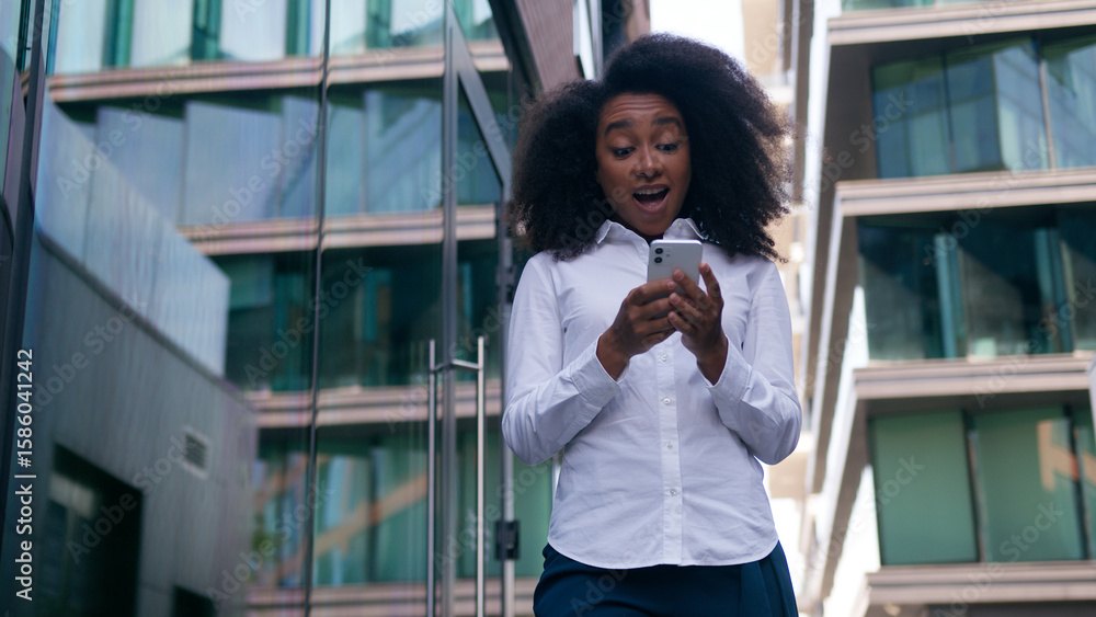 Happy African American woman businesswoman female holding mobile phone smartphone technology finance celebrate victory girl win achieve business deal manager employer e-commerce raise joy outside city