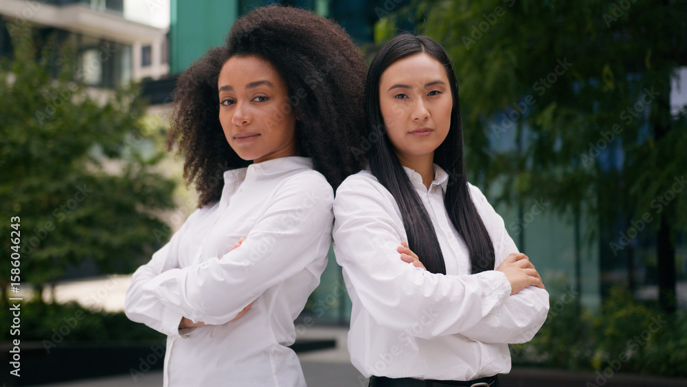 Serious Two African American Asian Chinese Japanese women crossed arms confident workers co-workers females businesswomen business city posing multiracial colleagues girls diverse teamwork outdoors