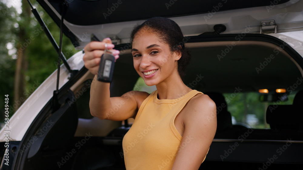 Happy African American woman sitting trunk new car owner driver driving auto transport outside showing keys purchase buyer achievement businesswoman business female girl buying joyful renting vehicle