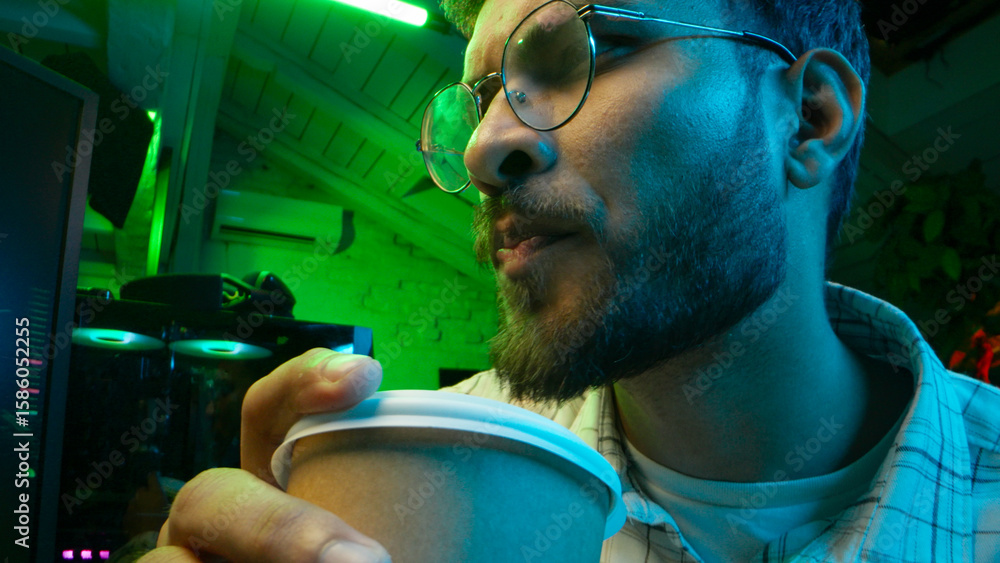 Pensive Caucasian man professional software engineer guy male coder programmer crypto specialist drinking coffee workplace looking computer thinking pondering creating innovative digital application