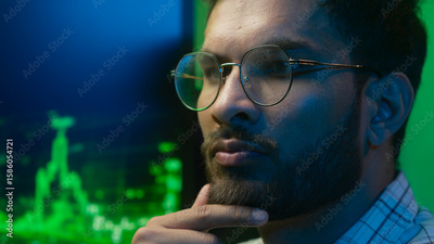 Confident programmer Arabian Indian man looking analyzing computer chart pc graph crypto currency bitcoin IT specialist freelancer male thinking ethnic guy broker trader neon office trading decision