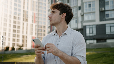 Pensive Caucasian man using mobile phone smartphone thinking thoughtful guy ponder looking around gps navigator maps online male businessman city business outdoors solution browsing employer problem