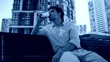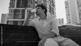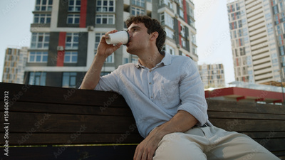Caucasian European man sitting on bench male holding cup coffee break drinking takeaway order customer buyer relax tasty drink guy student businessman employer entrepreneur business outdoor city rest