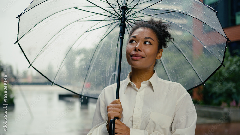 African American woman holding umbrella rain peaceful looking around weather girl businesswoman city outside pensive street thoughtful ethnic manager ceo female enjoyment business employee rainy lady