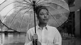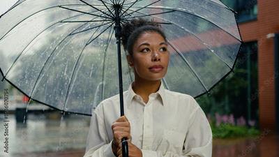 African American woman holding umbrella rain peaceful looking around weather girl businesswoman city outside pensive street thoughtful ethnic manager ceo female enjoyment business employee rainy lady