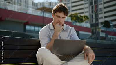 Caucasian thoughtful man thinking working laptop computer freelancer male guy businessman business city technology pensive task problem solution online typing busy employer outside entrepreneur ponder