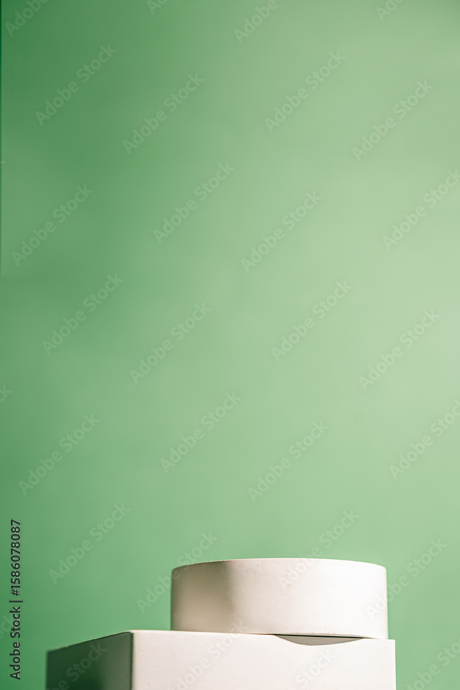 Minimal white cylindrical and rectangular podiums are placed against a soft green background. Perfect for showcasing skincare, cosmetics, eco-friendly products, or modern branding mockups