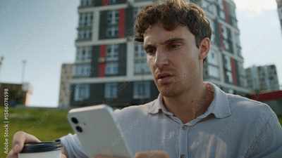 Frustrated Caucasian man reading bad news mobile phone smartphone cellphone male businessman stressed nervous guy city message error connection problem worried business outdoors holding cup coffee app