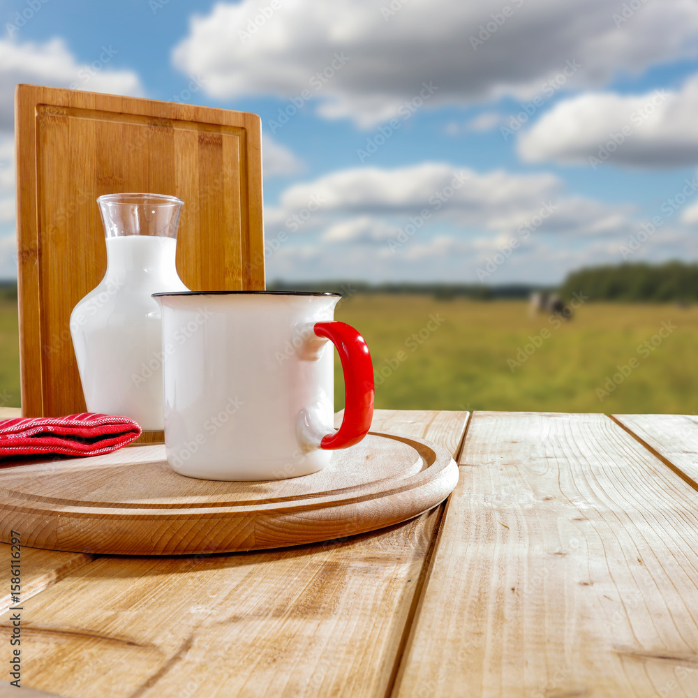 Copy space with milk, kitchen tools and cutting board on wooden kitchen table – blurred background shows cow on meadow, pasture and countryside, concept of natural dairy and cooking