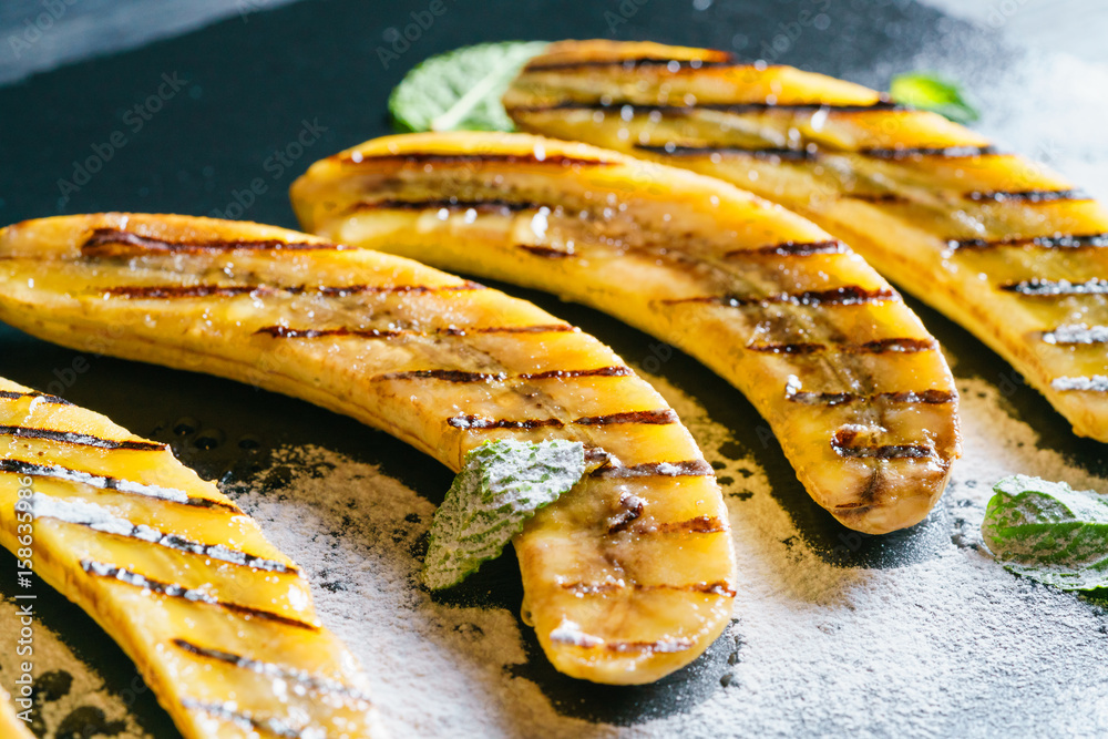 Halves of grilled bananas are nicely laid on a black kitchen board and shale stone. Dish is poured with clear honey, sprinkled with sugar powder and decorated with green mint leaves. Close Up.