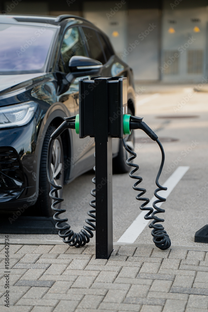 Electric vehicle at charging station in urban parking lot with green energy cables and sustainable transport technology representing clean mobility and environmental innovation