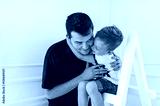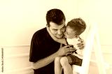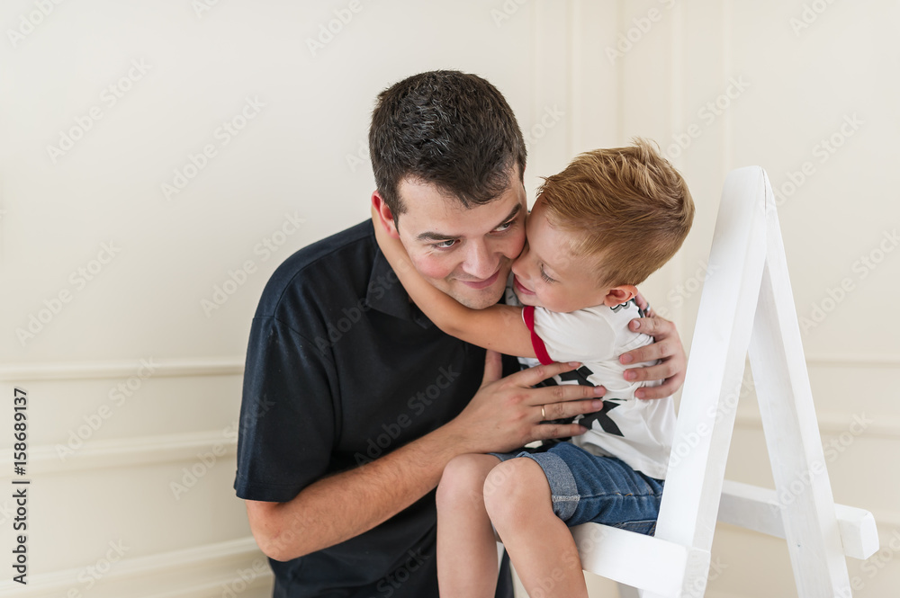 The son embraces the beloved daddy. Little boy is sitting on a step-ladder