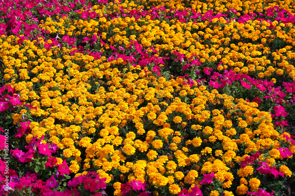 Beautiful Marigolds (Tagetes) and pink Petunia flowers