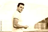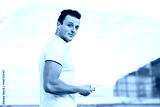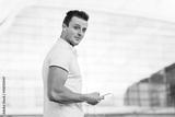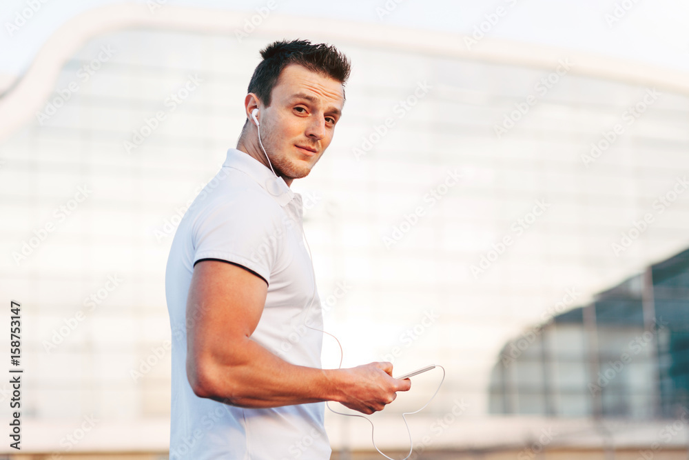 Handsome young man in white T-shirt using smartphone on Airport Parking