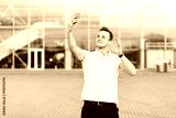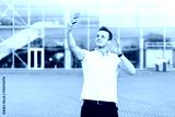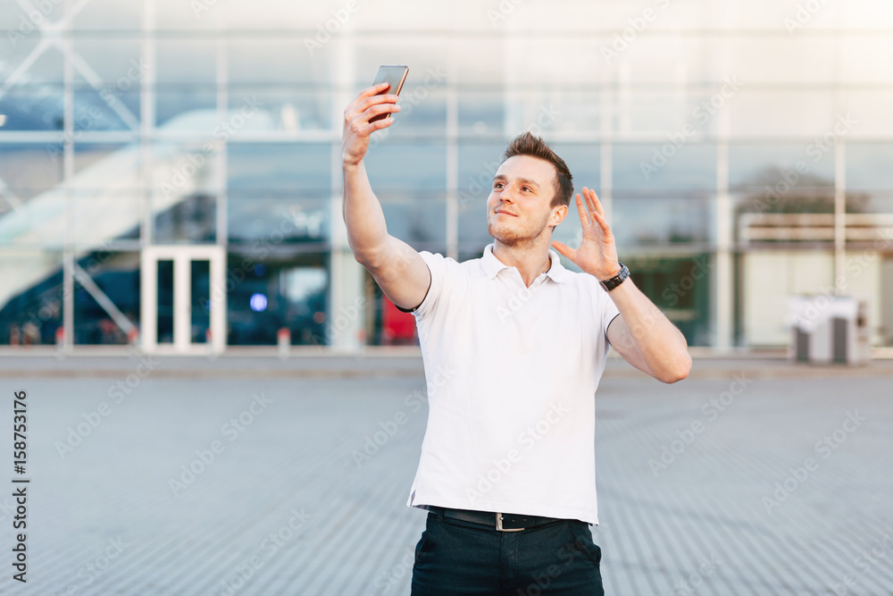 Handsome young man in white T-shirt using smartphone on Airport Parking