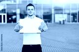 Handsome young man in white T-shirt present notebook on the camera