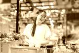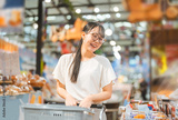 Young adult asian woman consumer choosing ready meals cooked food at supermarket store choice buying