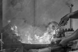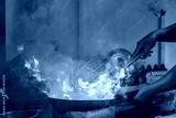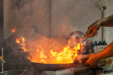 Man is cooking food in a kitchen with a lot of smoke and fire