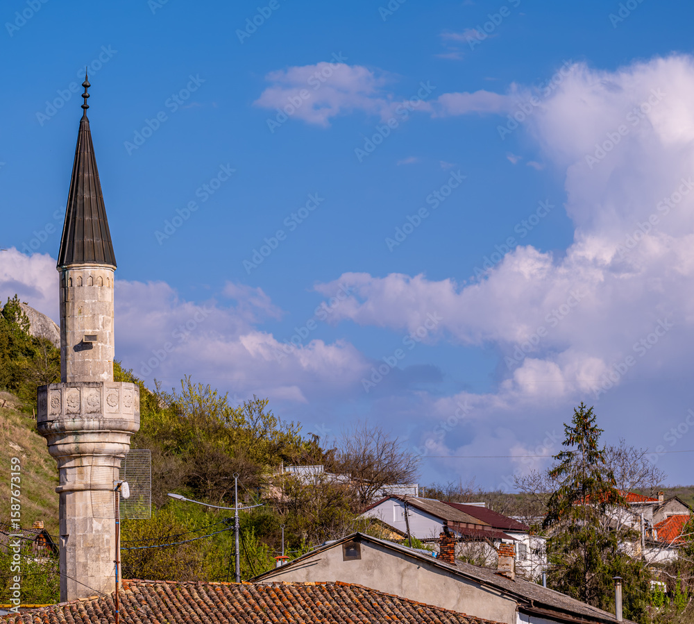 Mosque minaret against the background of hills on a summer day.