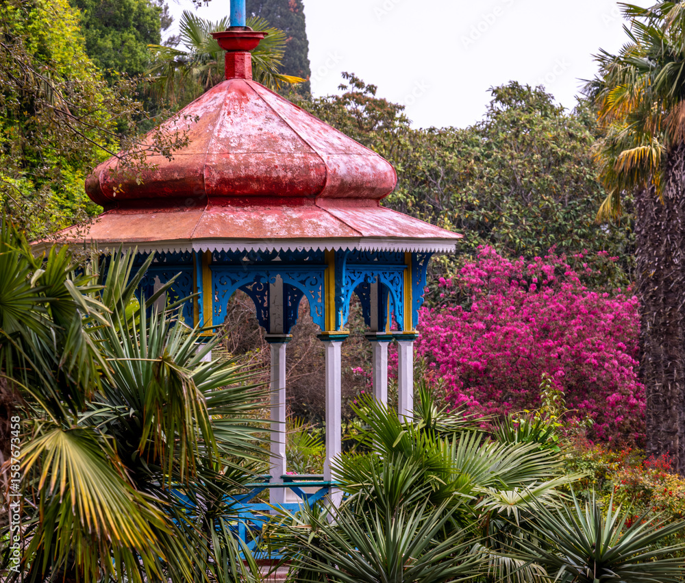 An old gazebo among palm trees and flowers in the park on a summer day.