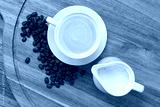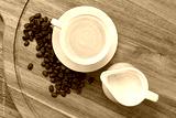 Coffee concept: Top view of white porcelain cup filled with delicious frothy coffee, jug of milk and fresh roasted coffee beans on rustic wooden background.