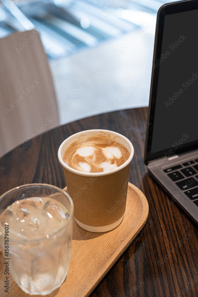 Close-up of Hot coffee latte with latte art milk foam in cup made of paper and laptop computer on wood desk office desk in coffee shop at the cafe,during business work concept