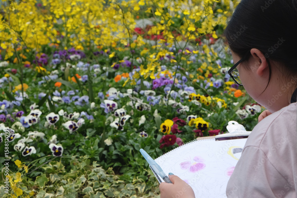 Young asian girl drawing flowers in the garden