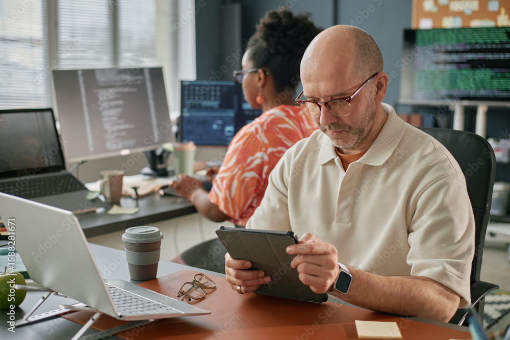 Middle aged Caucasian man using digital tablet at desk while Black woman working on computer in background, both focused on technology tasks in modern office workspace