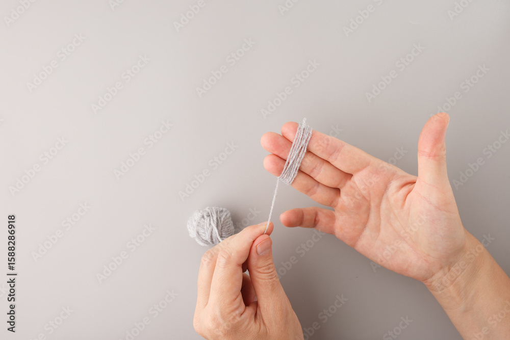 a pair of hands working with a piece of gray yarn. small ball of yarn, wraps it around fingers. light gray surface, mid-process, prepping materials. pompom, DIY tassel, easy yarn tail