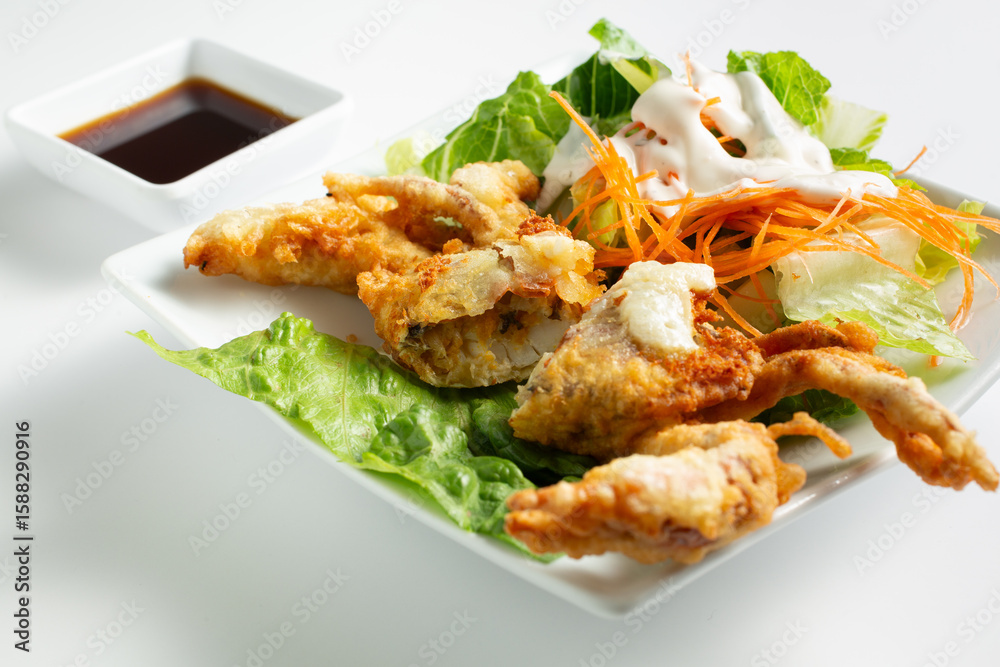 A view of a soft shell crab appetizer.