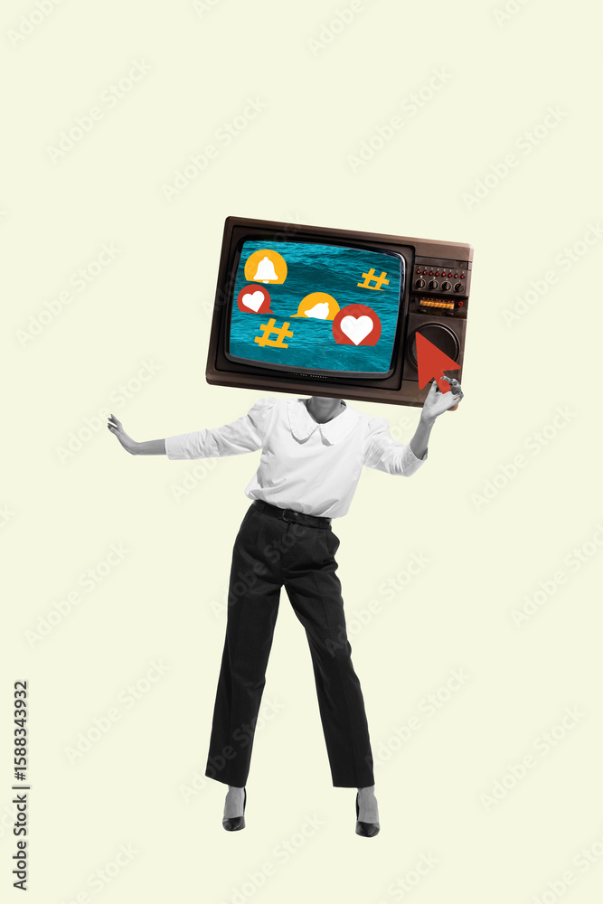 Conceptual collage with person head replaced by retro TV filled with social icons and red cursor. Concept of identity distortion, screen addiction, and media literacy education.